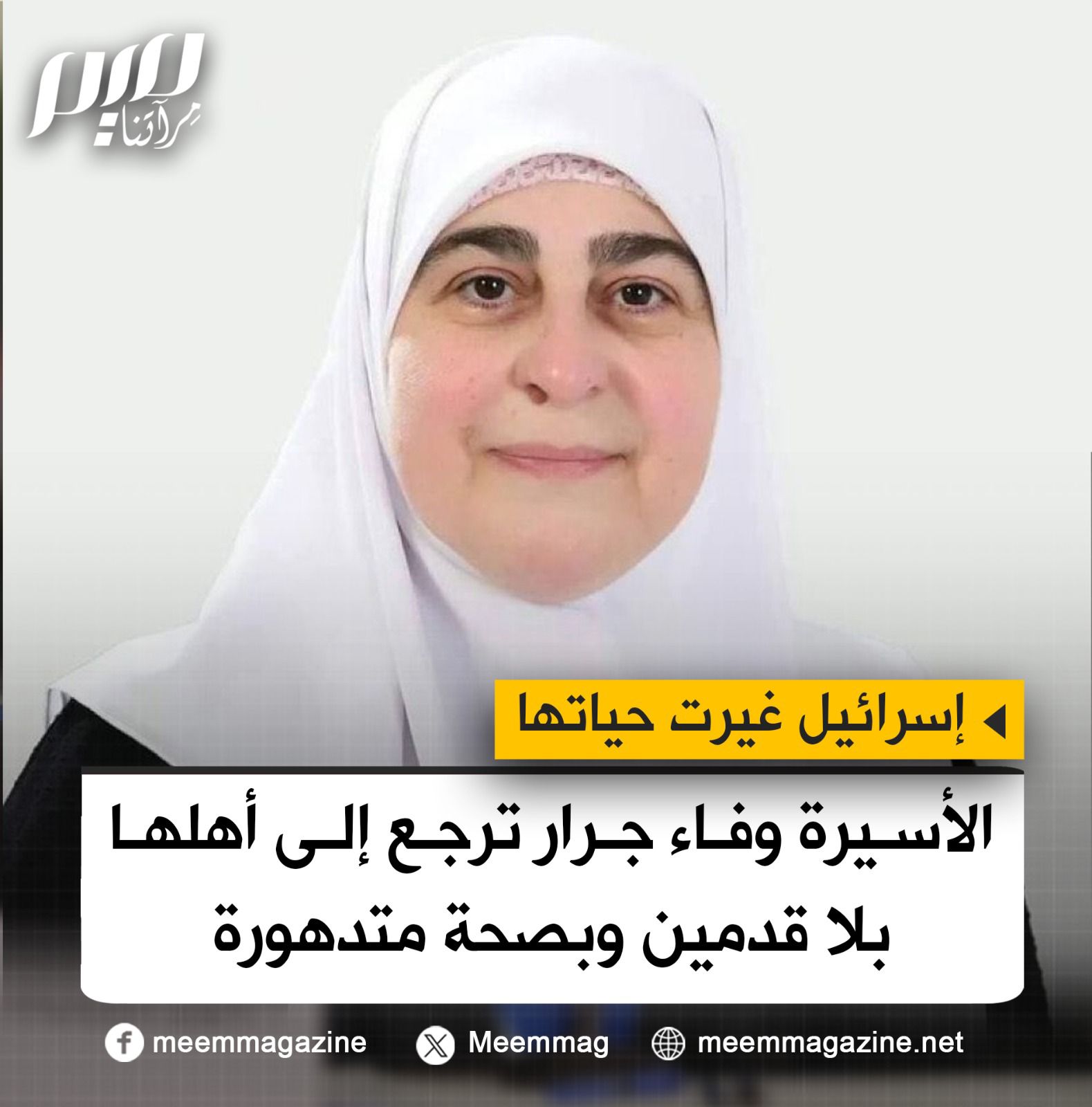 "بتر في الساقين، كسور في الضلوع، كدمات في الرئة، والتهاب في الدم".. بعد 9 أيام على اعتقالها، الاحتـ.ـلال يفرج عن الأسيرة وفاء جرار، للتنصل من جريـ.ـمته، بعدما سلب منها صحتها.