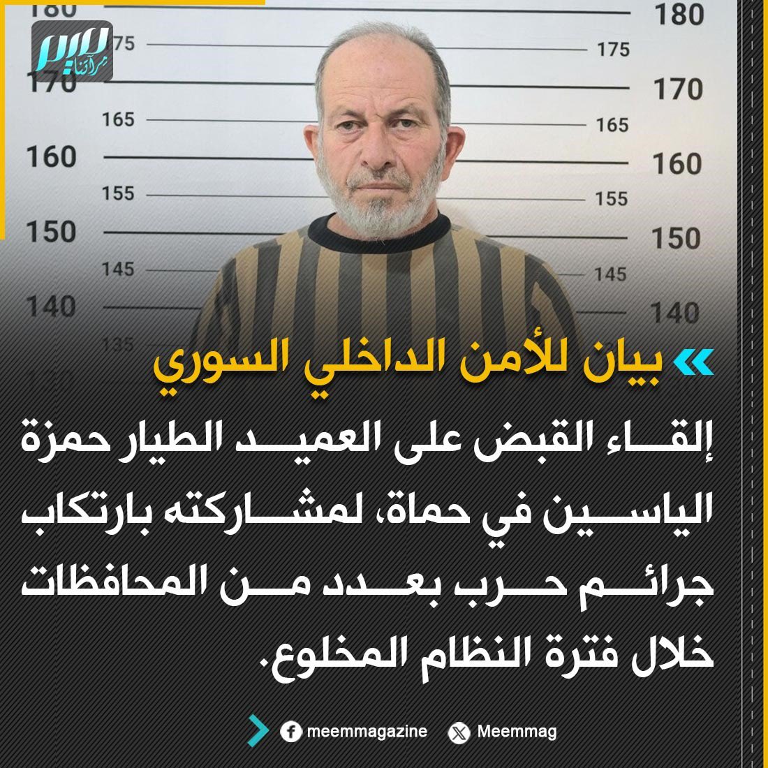 إلقاء القبض على العميد الطيار حمزة الياسين في حماة، لمشاركته بارتكاب جرائم حرب بعدد من المحافظات خلال فترة النظام المخلوع، بحسب بيان للأمن الداخلي السوري.