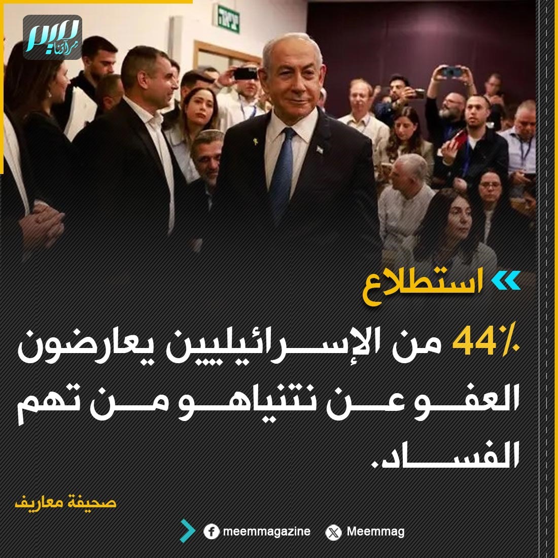استطلاع معهد "لازار" الإسرائيلي: 44% من الإسرائيليين يعارضون العفو عن نتنياهو من تهم الفساد.