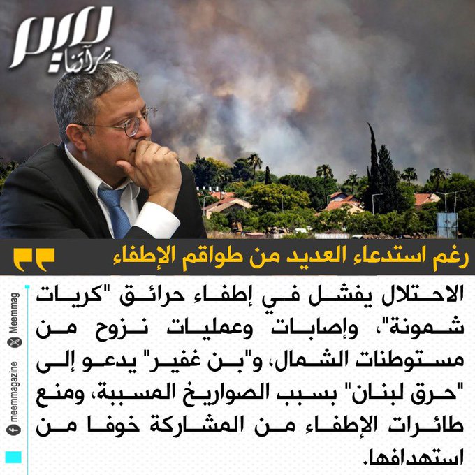 رغم استدعاء العديد من طواقم الإطفاء الإسرائيلية.. استمرار الحرائق في كريات شمونة، وإصابات وعمليات نزوح من مستوطنات الشمال، ومنع طائرات الإطفاء من المشاركة خوفا من استهدافها.