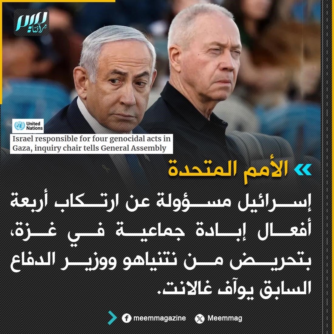 الأمم المتحدة: إسرائيل مسؤولة عن ارتكاب أربعة أفعال إبادة جماعية في غزة، بتحريض من نتنياهو ووزير الدفاع السابق يوآف غالانت.