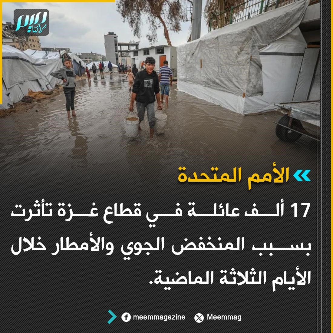 الأمم المتحدة: 17 ألف عائلة في قطاع غزة تأثرت بسبب المنخفض الجوي والأمطار خلال الأيام الثلاثة الماضية.