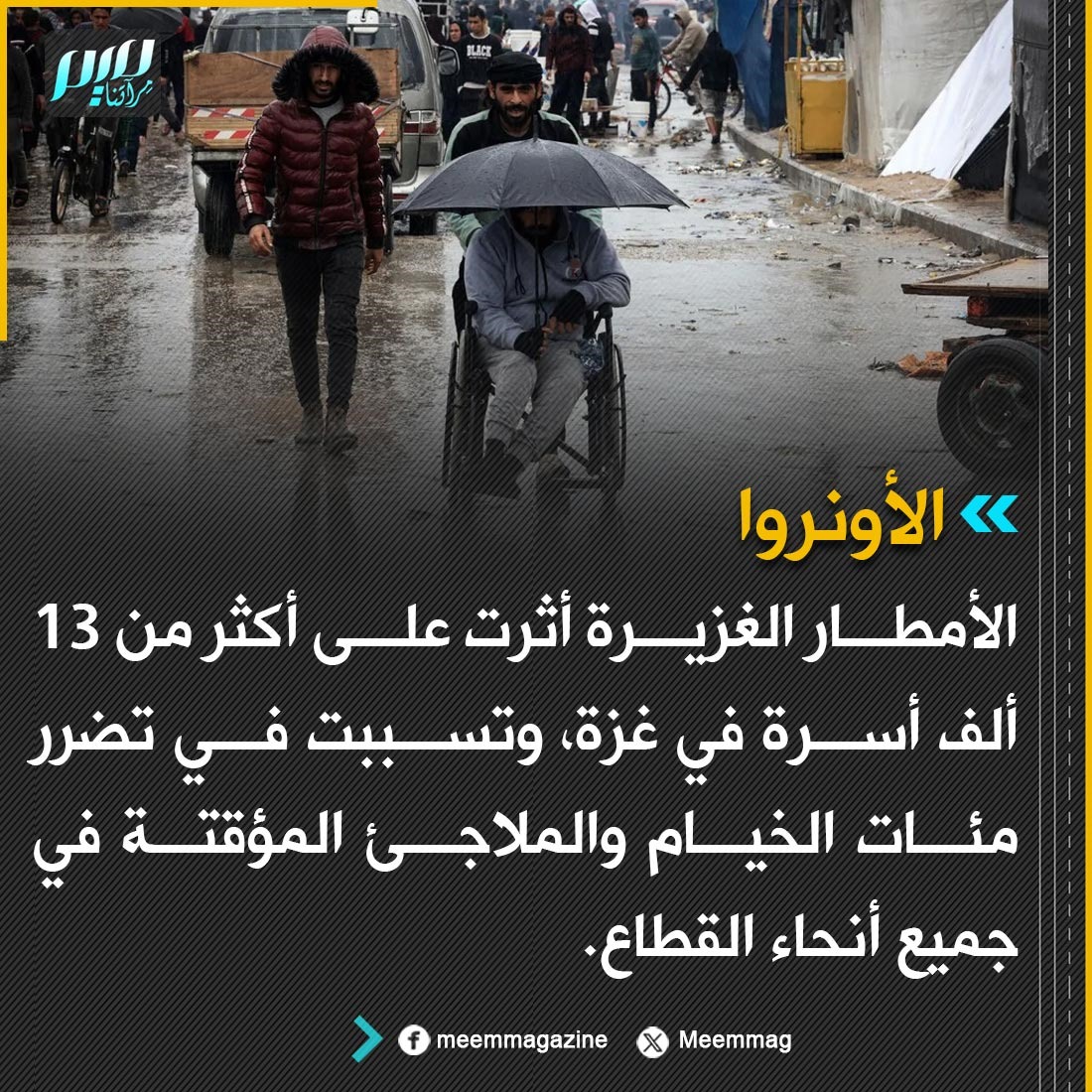 الأونروا: الأمطار الغزيرة أثرت على أكثر من 13 ألف أسرة في غزة، وتسببت في تضرر مئات الخيام والملاجئ المؤقتة في جميع أنحاء القطاع.