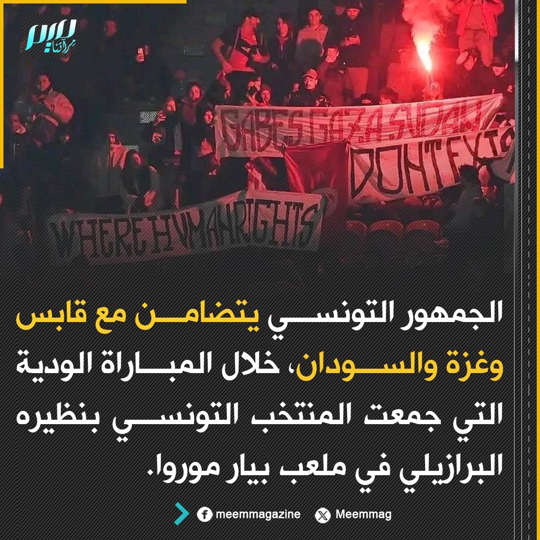 الجمهور التونسي يتضامن مع قابس وغزة والسودان، خلال المباراة الودية التي جمعت المنتخب التونسي بنظيره البرازيلي في ملعب بيار موروا.