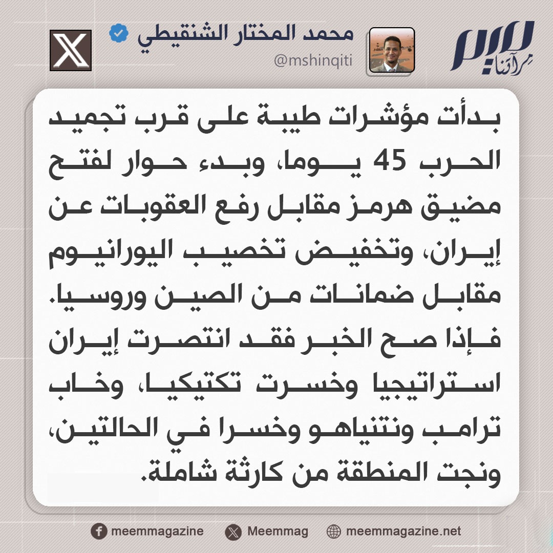 الشنقيطي: إذا صح الخبر فقد انتصرت إيران استراتيجيا وخسرت تكتيكيا، وخاب ترامب ونتنياهو وخسرا في الحالتين، ونجت المنطقة من كارثة شاملة.