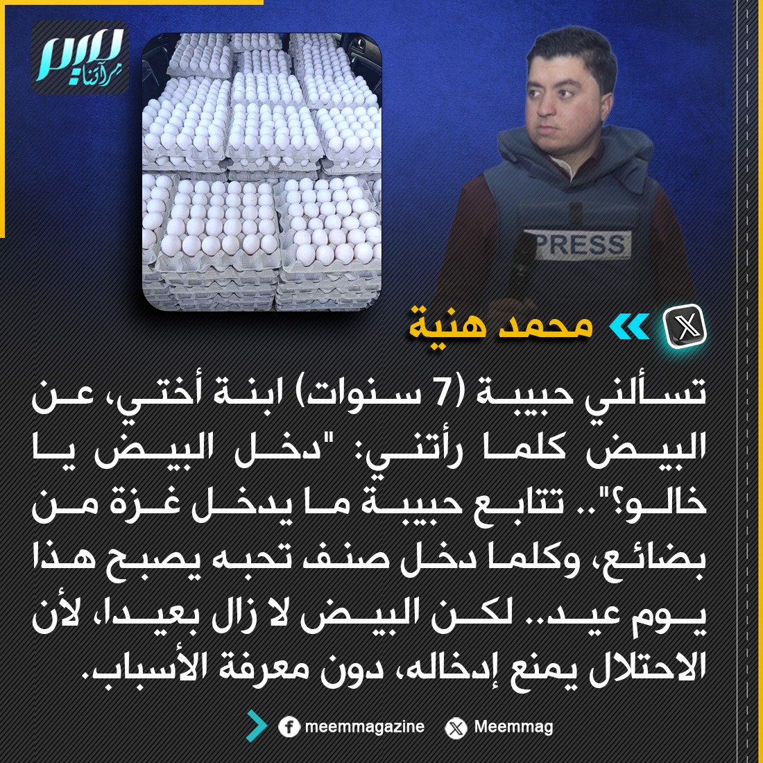 الصحفي الغزي محمد هنية: تسألني حبيبة (7 سنوات) عن البيض كلما رأتني: "دخل البيض يا خالو؟".. البيض لا زال بعيدا، لأن الاحتلال يمنع إدخاله، دون معرفة الأسباب.