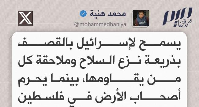 الصحفي محمد هنية: يُسمح لإسرائيل بالقصف بذريعة نزع السلاح وملاحقة كل من يقاومها، بينما يُحرَم أصحاب الأرض في فلسطين ولبنان وسوريا الذين يواجهون الاحتلال والقتل والتهجير، من حقهم في حمل السلاح والدفاع عن أنفسهم!