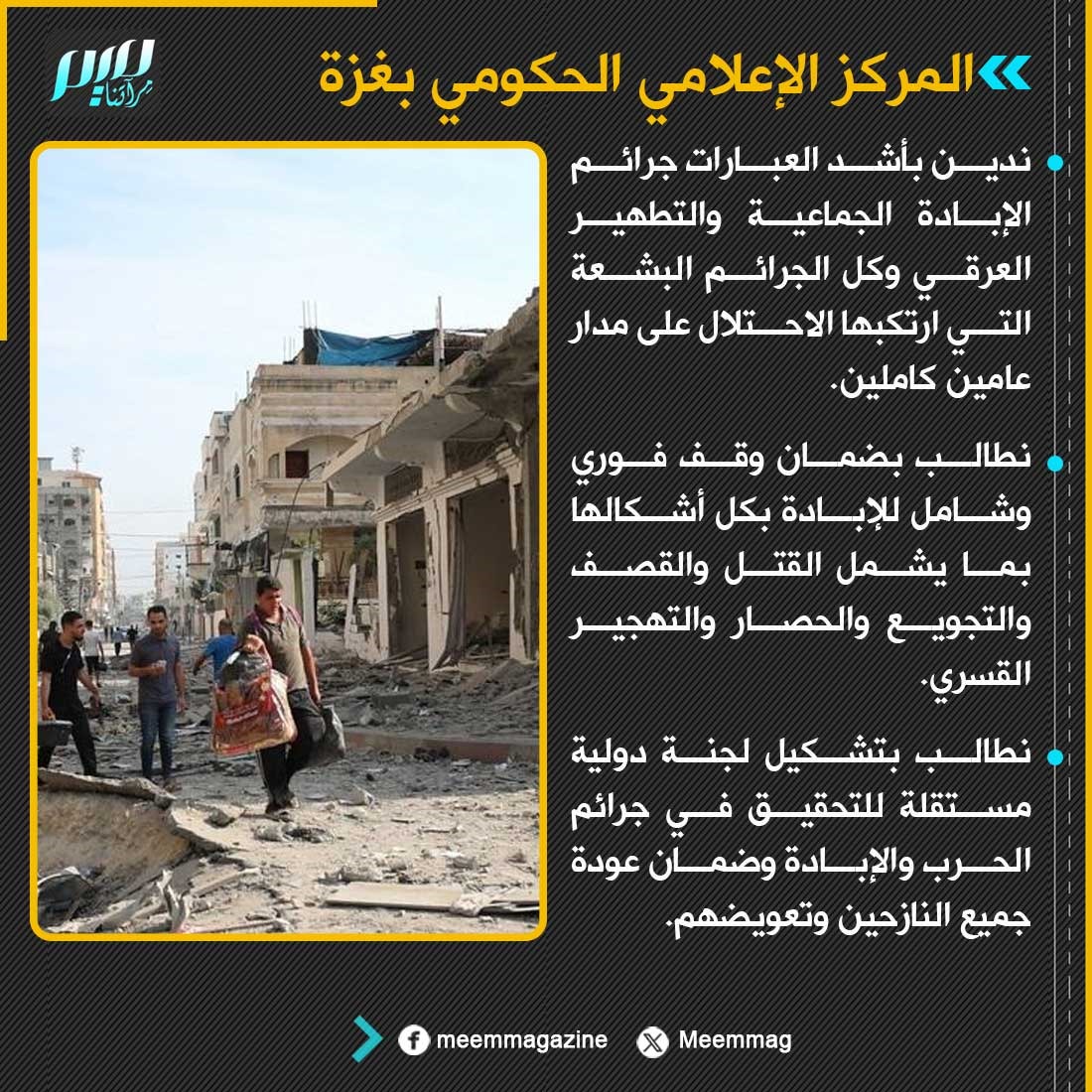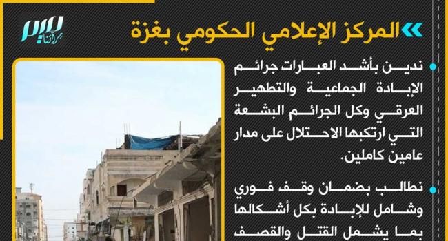 المركز الإعلامي الحكومي بغزة: نطالب بتشكيل لجنة دولية مستقلة للتحقيق في جرائم الحرب والإبادة وضمان عودة جميع النازحين وتعويضهم.