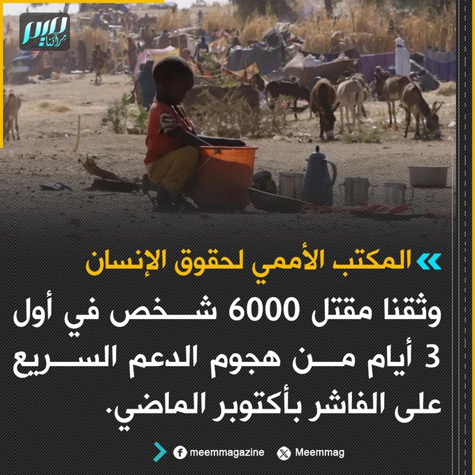 المكتب الأممي لحقوق الإنسان: وثقنا مقتل 6000 شخص في أول 3 أيام من هـ.جـ.وم الدعم السريع على الفاشر بأكتوبر الماضي.