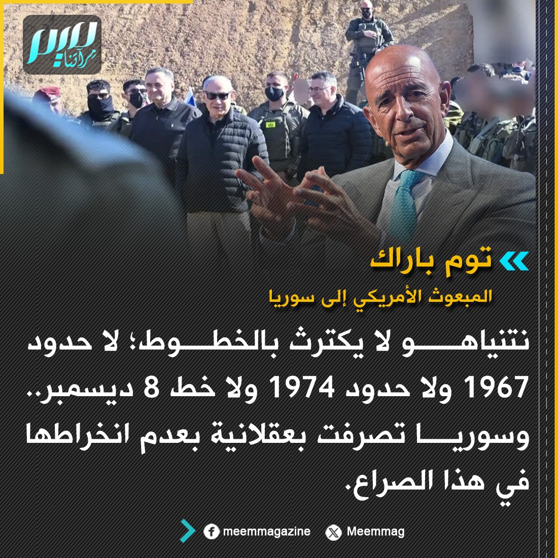 توم باراك: نتنياهو لا يكترث بالخطوط؛ لا حدود 1967 ولا حدود 1974 ولا خط 8 ديسمبر.. وسوريا تصرفت بعقلانية بعدم انخراطها في هذا الصراع.