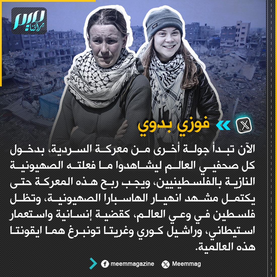 بدوي: الآن تبدأ جولة أخرى من معركة السردية، بدخول كل صحفيي العالم ليشاهدوا ما فعلته الصهيونية النازية بالفلسطينيين، ويجب ربح هذه المعركة حتى يكتمل مشهد انهيار الهاسبارا الصهيونية، وتظل فلسطين في وعي العالم، كقضية إنسانية واستعمار استيطاني، وراشيل كوري وغريتا تونبرغ هما ايقونتا هذه العالمية.