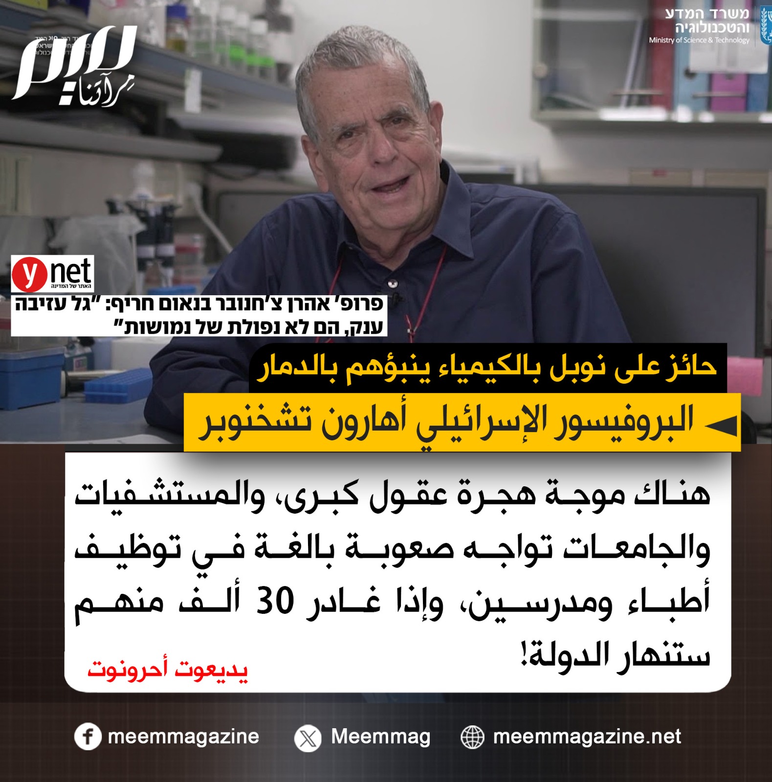 بروفيسور إسرائيلي حائز على نوبل بالكيمياء يبشر الاحتلال بالخراب!