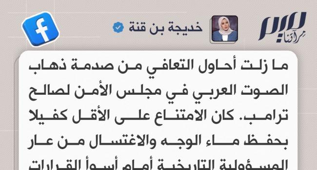 الإعلامية خديجة بن قنة: ما زلت أحاول التعافي من صدمة ذهاب الصوت العربي في مجلس الأمن لصالح ترامب.