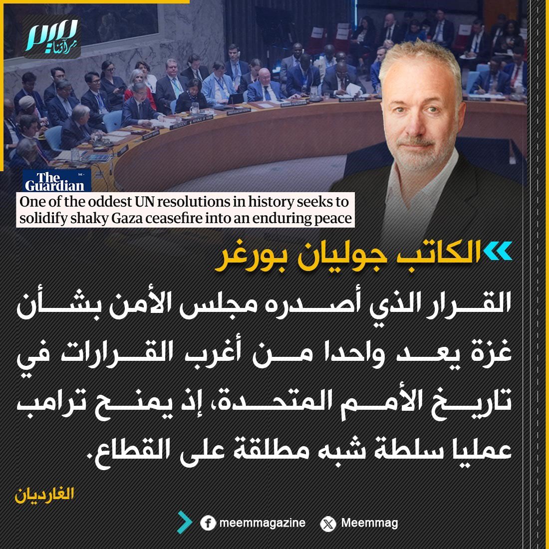 الكاتب جوليان بورغر: القرار الذي أصدره مجلس الأمن بشأن غزة يعد واحدا من أغرب القرارات في تاريخ الأمم المتحدة، إذ يمنح ترامب عمليا سلطة شبه مطلقة على القطاع.