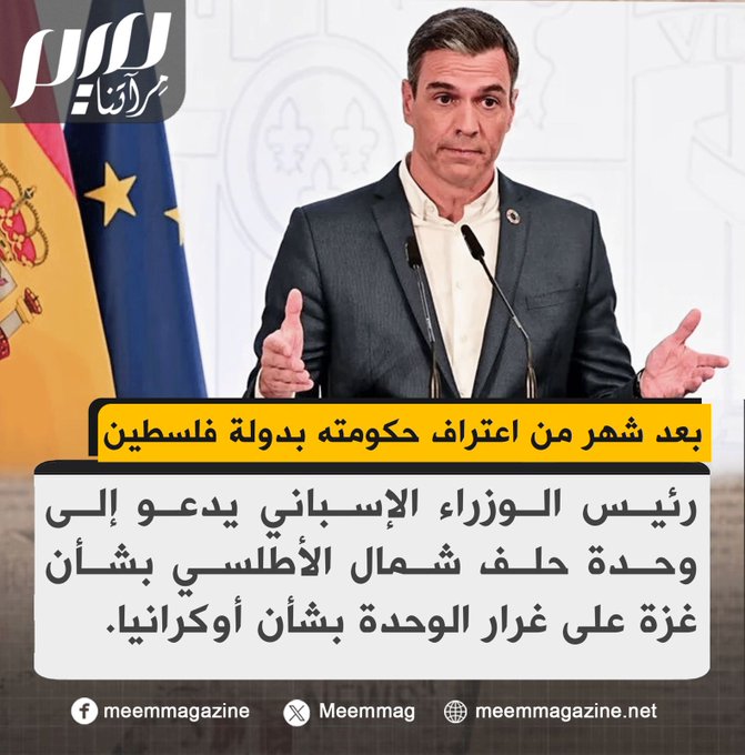 بعد شهر من اعتراف حكومته بدولةفلسطين.. رئيس الوزراء الإسباني بيدرو سانشيز يدعو إلى وحدة حلف شمال الأطلسي بشأن غزة على غرار الوحدة بشأن أوكرانيا.