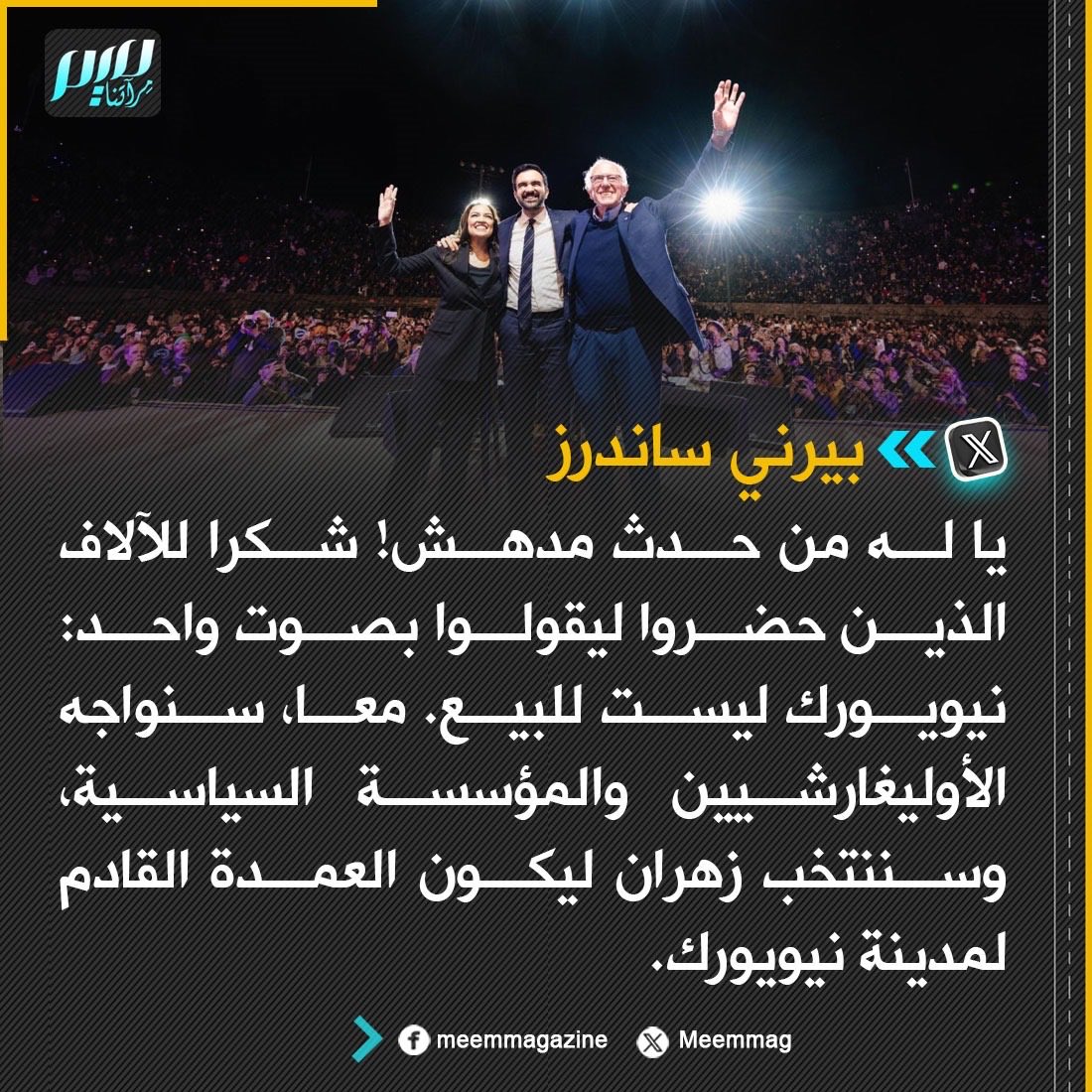 بيرني ساندرز: معا، سنواجه الأوليغارشيين والمؤسسة السياسية، وسننتخب زهران ليكون العمدة القادم لمدينة نيويورك.