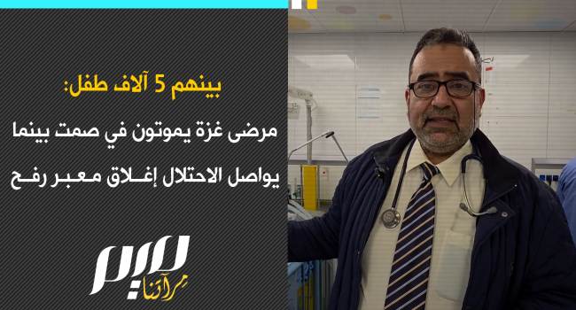 مدير أقسام الأطفال والولادة في مجمع ناصر الطبي، د. أحمد الفرا لـ"ميم": نحو 22 ألف مريض في غزة ينتظرون إجلاءهم خارج القطاع لتلقي العلاج، بينهم 5 آلاف بحاجة لتحويل عاجل. ومع استمرار إغلاق الاحتلال لمعبر رفح، يواجه هؤلاء المرضى خطر الموت بصمت.