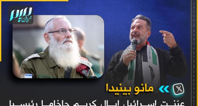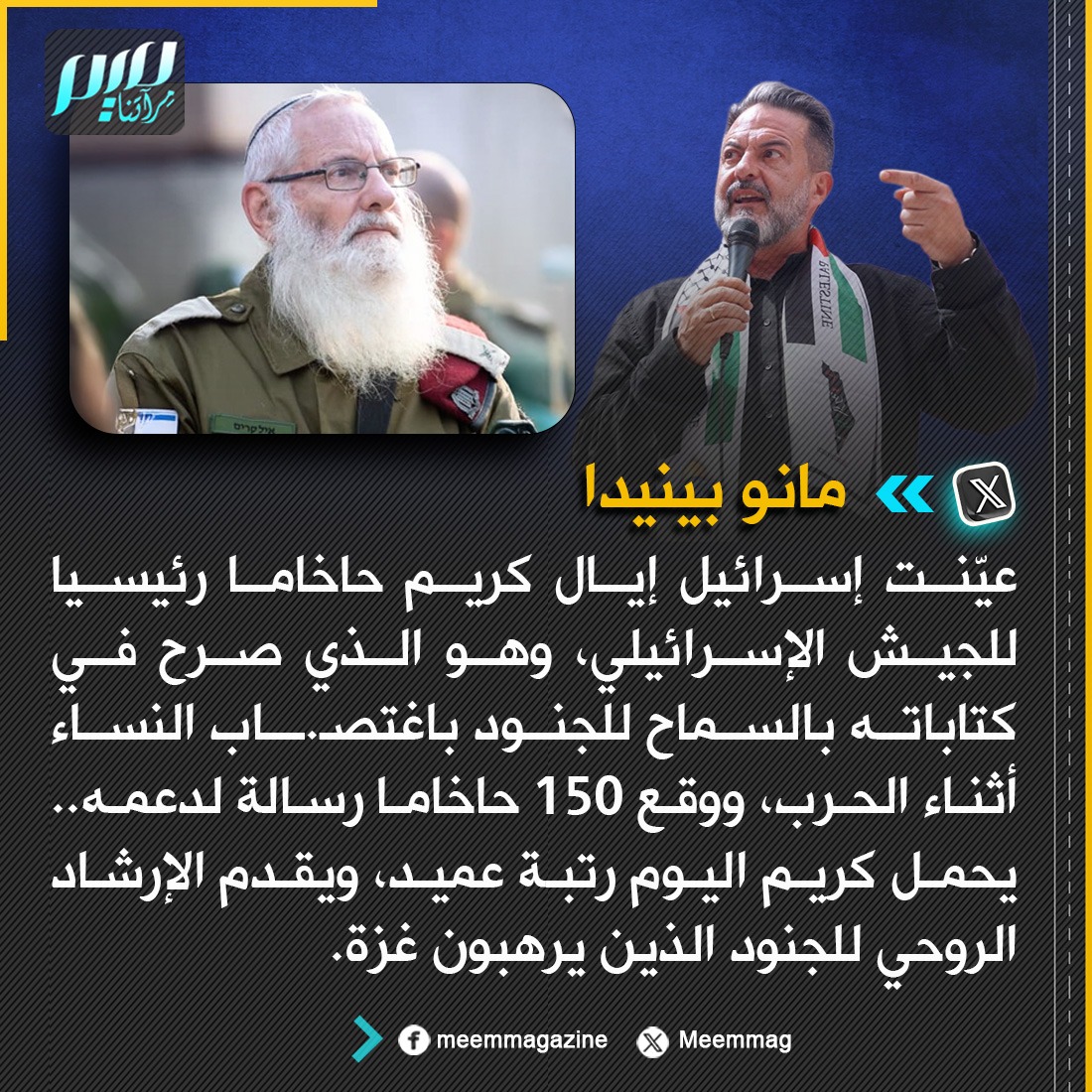 البرلماني الأوروبي السابق مانو بينيدا: عيّنت إسرائيل إيال كريم حاخاما رئيسيا للجيش الإسرائيلي، وهو الذي صرح في كتاباته بالسماح للجنود باغتصـ.ـاب النساء أثناء الحرب!