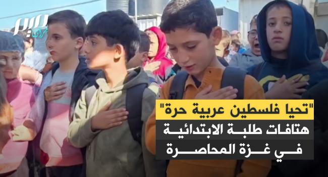 "تحيا فلسطين عربية حرة" و"القدس لنا".. طلاب المرحلة الابتدائية يرددون هتافات وطنية قبيل دخولهم إلى فصولهم الدراسية بمواصي خان يونس جنوب قطاع غزة.