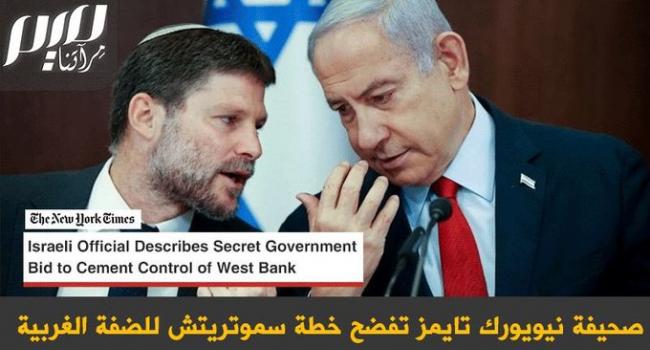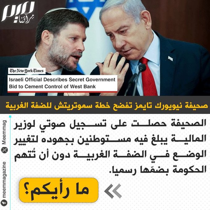 تسجيل صوتي مسرب لوزير وزير مالية الاحتلال سموتريتش نشرته صحيفة "نيويورك تايمز" يفضح مخطط الحكومة للسيطرة على الضفة الغربية، دون اتهامها دوليا بضمها رسميا!