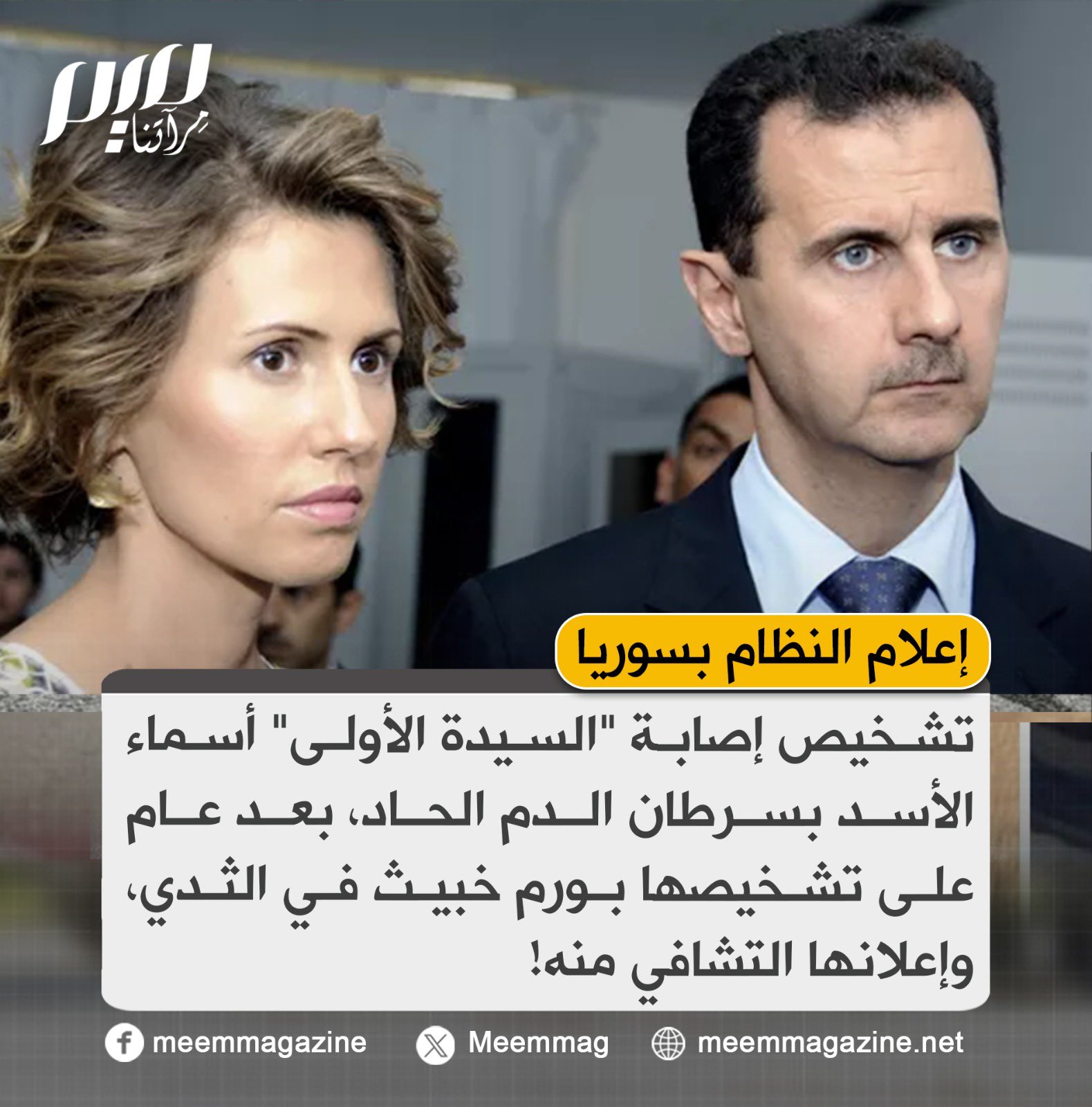 تشخيص إصابة أسماء الأسد بسرطان الدم الحاد، بعد عام على تشخيصها بورم خبيث في الثدي، وإعلانها التشافي منه، وفق بيان لرئاسة نظام الأسد.