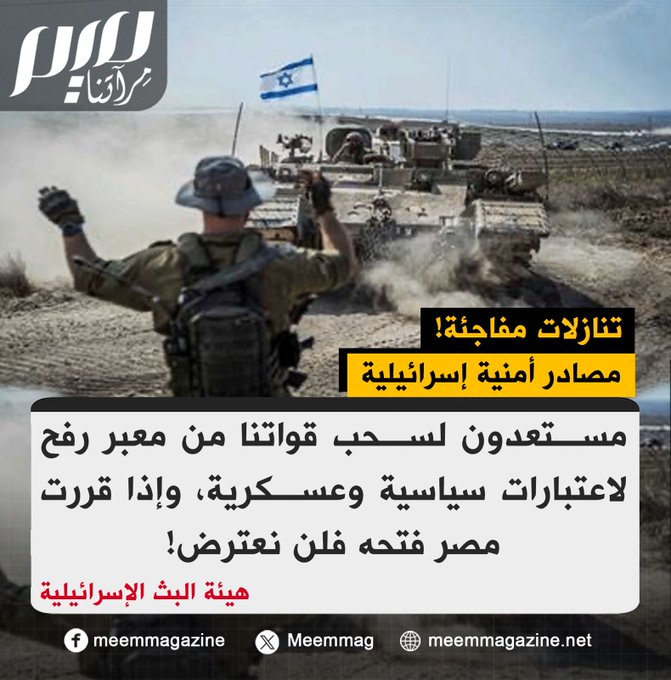 تنازلات مفاجئة.. مصادر أمنية إسرائيلية: "مستعدون لسحب قواتنا من معبر رفح لاعتبارات سياسية وعسكرية، وإذا قررت مصر فتحه فلن نعترض"، وفق حديثهم لهيئة البث الإسرائيلية.