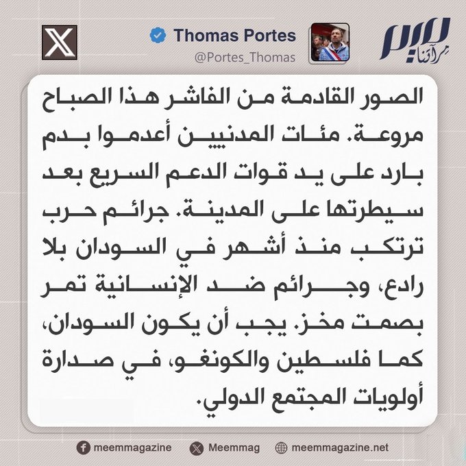 البرلماني الفرنسي توماس بورتس: جرائم حرب ترتكب منذ أشهر في السودان بلا رادع، وجرائم ضد الإنسانية تمر بصمت مخز.
