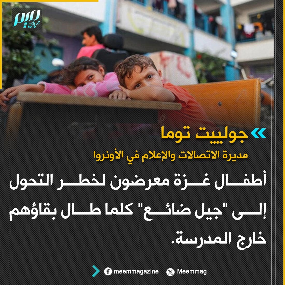 جولييت توما: أطفال غزة معرضون لخطر التحول إلى "جيل ضائع" كلما طال بقاؤهم خارج المدرسة.