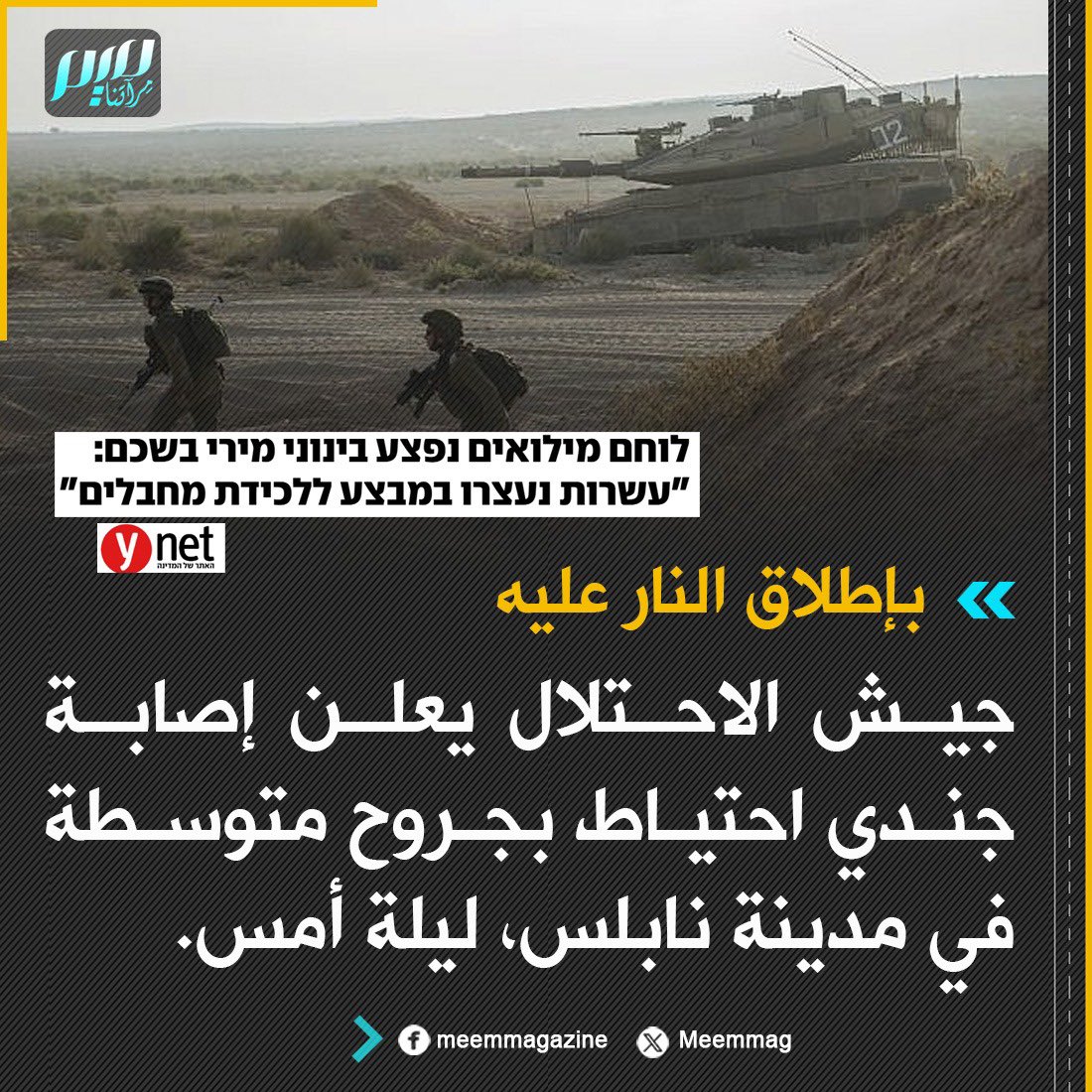 جيش الاحتلال يعلن إصابة جندي احتياط بجروح متوسطة بإطلاق النار عليه في مدينة نابلس، ليلة أمس.