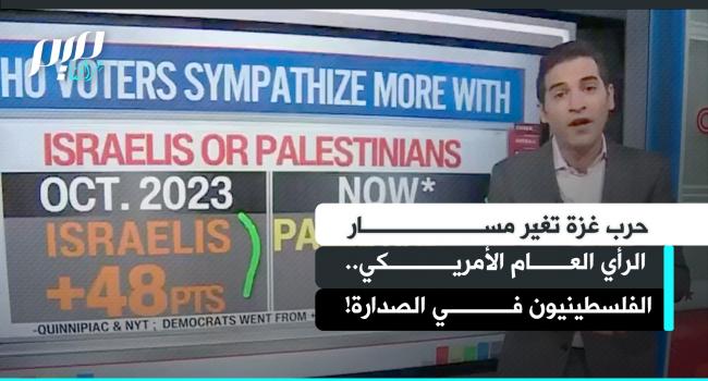 في تحول وصفه بـ"التاريخي".. تقرير لشبكة "سي أن أن" يُظهر لأول مرة منذ الثمانينيات أن نسبة الأمريكيين المتعاطفين مع الفلسطينيين تجاوزت نسبة المؤيدين للإسرائيليين، في نقلة نوعية سببها الحرب الأخيرة على غزة.