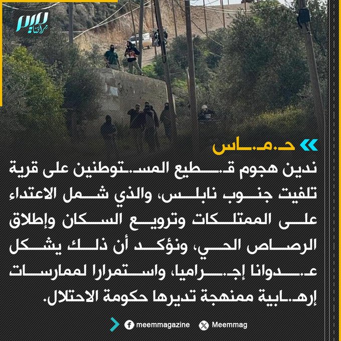 حركة حـ.ـماس: ندين هجوم قـ.ـطيع المسـ.ـتوطنين على قرية تلفيت جنوب نابلس، والذي شمل الاعتداء على الممتلكات وترويع السكان وإطلاق الرصاص الحي.
