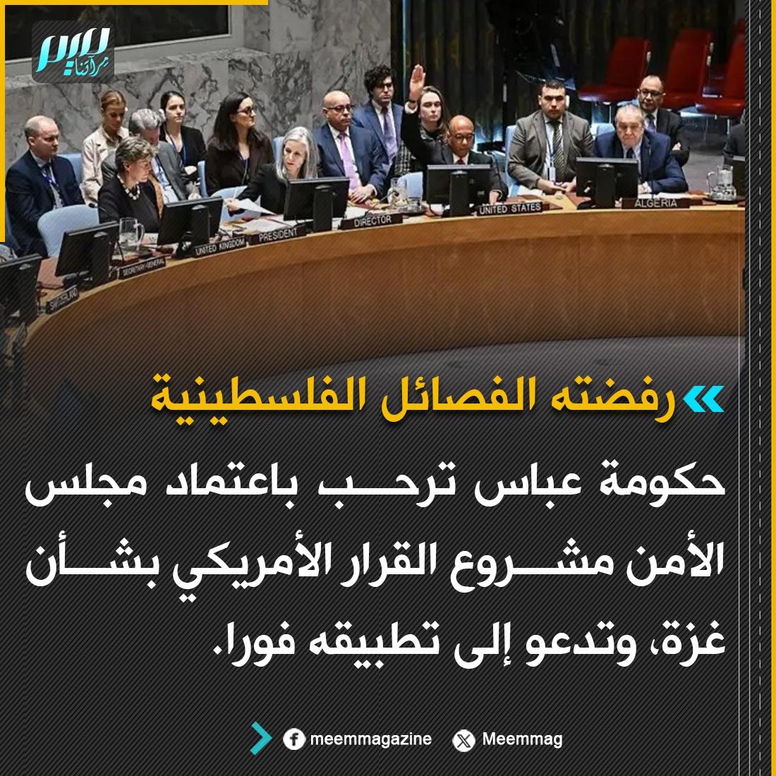 حكومة عباس ترحب باعتماد مجلس الأمن مشروع القرار الأمريكي بشأن غزة، وتدعو إلى تطبيقه فورا.