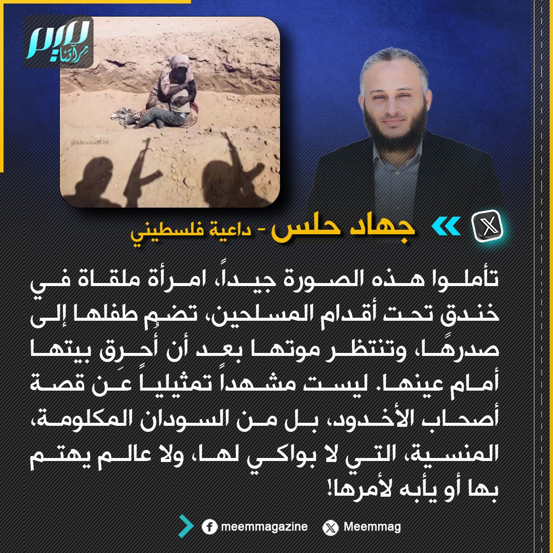 داعية فلسطيني: تأملوا هذه الصورة جيداً، امرأة ملقاة في خندقٍ تحت أقدام المسلحين، تضم طفلها إلى صدرها، وتنتظر موتها بعد أن أُحرِق بيتها أمام عينها. ليست مشهداً تمثيلياً عن قصة أصحاب الأخدود، بل من السودان المكلومة، المنسية، التي لا بواكي لها، ولا عالم يهتم بها أو يأبه لأمرها!