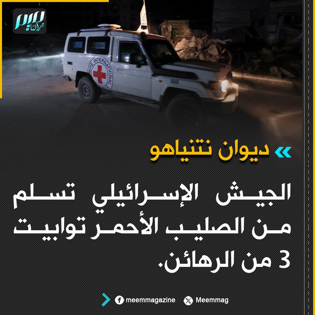 ديوان نتنياهو: الجيش الإسرائيلي تسلم من الصليب الأحمر توابيت 3 من الرهائن.