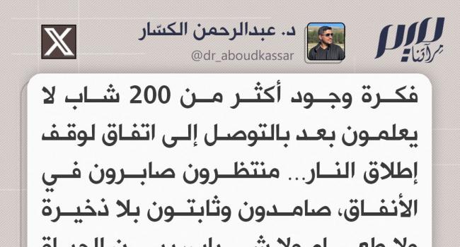 د. عبد الرحمان الكسار: فكرة وجود أكثر من 200 شاب لا يعلمون بعد بالتوصل إلى اتفاق لوقف إطلاق النار