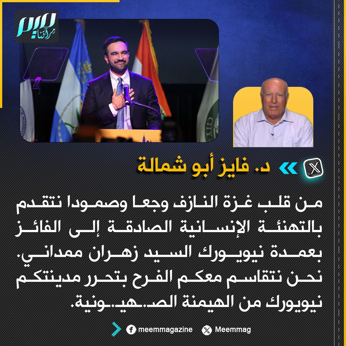 د. فايز أبو شمالة: من قلب غزة النازف وجعا وصمودا نتقدم بالتهنئة الإنسانية الصادقة إلى الفائز بعمدة نيويورك زُهران ممداني.