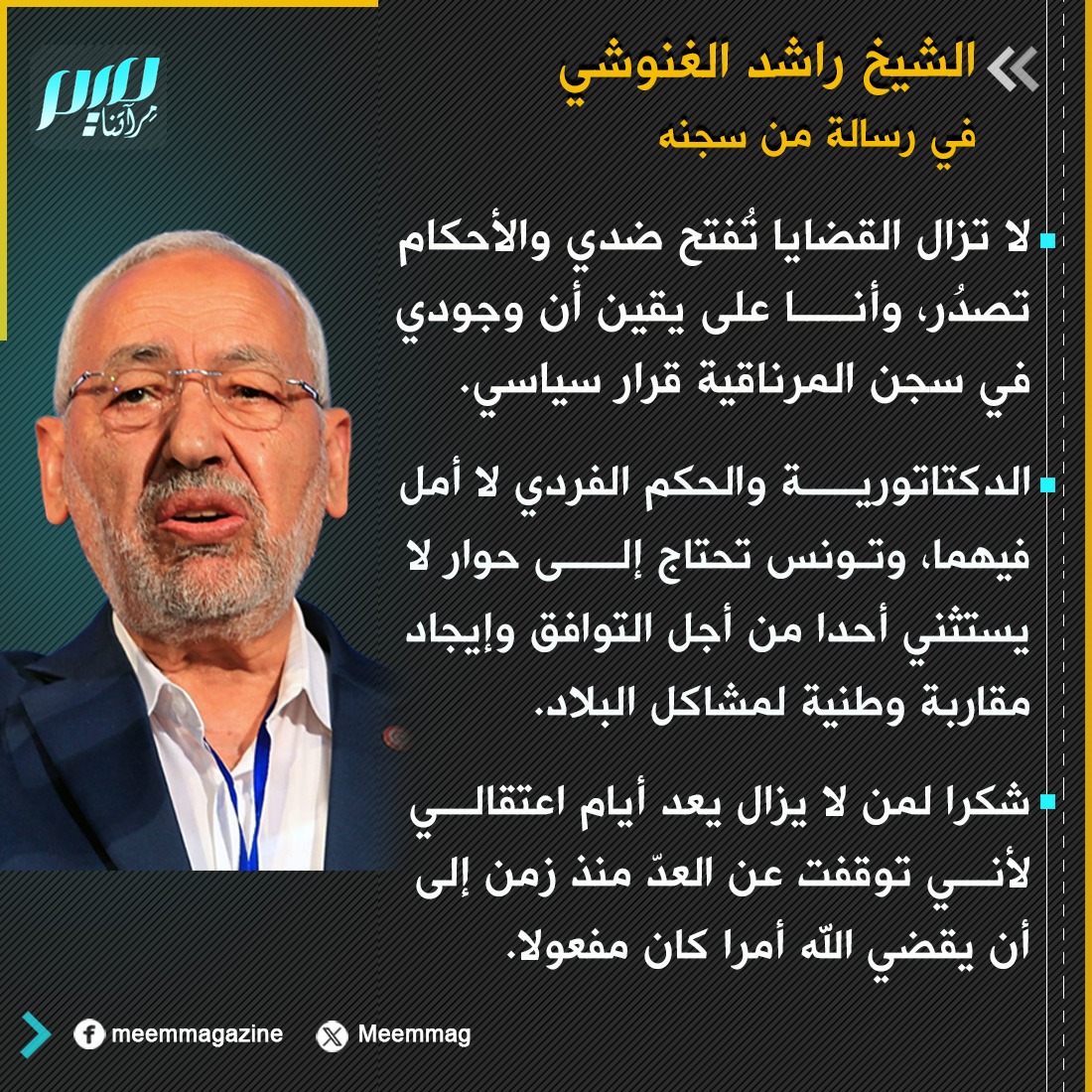 رئيس حركة النهضة التونسية، في رسالة كتبها من سجنه: شكرا لمن لا يزال يعدّ أيام اعتقالي، فقد توقفت عن العدّ منذ زمن، إلى أن يقضي الله أمرا كان مفعولا.