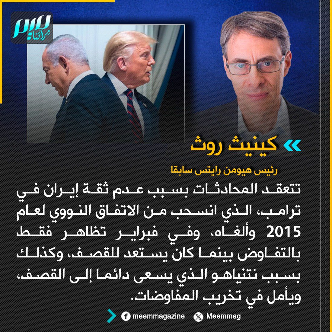 رئيس هيومن رايتس سابقا: تتعقد المحادثات بسبب عدم ثقة إيران في ترامب، الذي انسحب من الاتفاق النووي لعام 2015 وألغاه، وفي فبراير تظاهر فقط بالتفاوض بينما كان يستعد للقصف، وكذلك بسبب نتنياهو الذي يسعى دائما إلى القصف، ويأمل في تخريب المفاوضات.