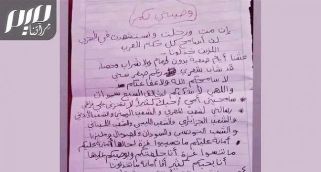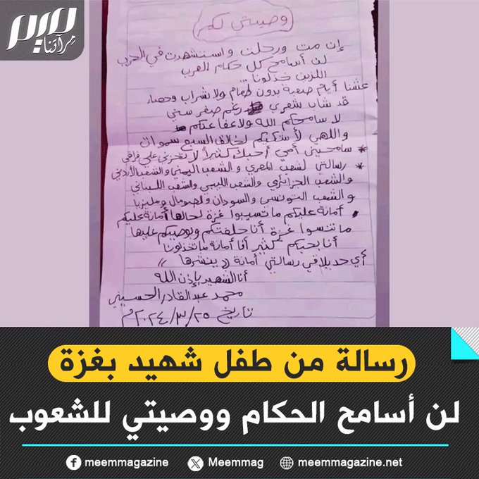 رسالة صارخة للحكام من الطفل الشهيد محمد عبدالقادر الحسيني، ووصية تخط بماء العيون للشعوب، وقد شابه مضمونها رسائل القائد الفلسطيني عبدالقادر الحسيني الذي ارتقى عام 1948.