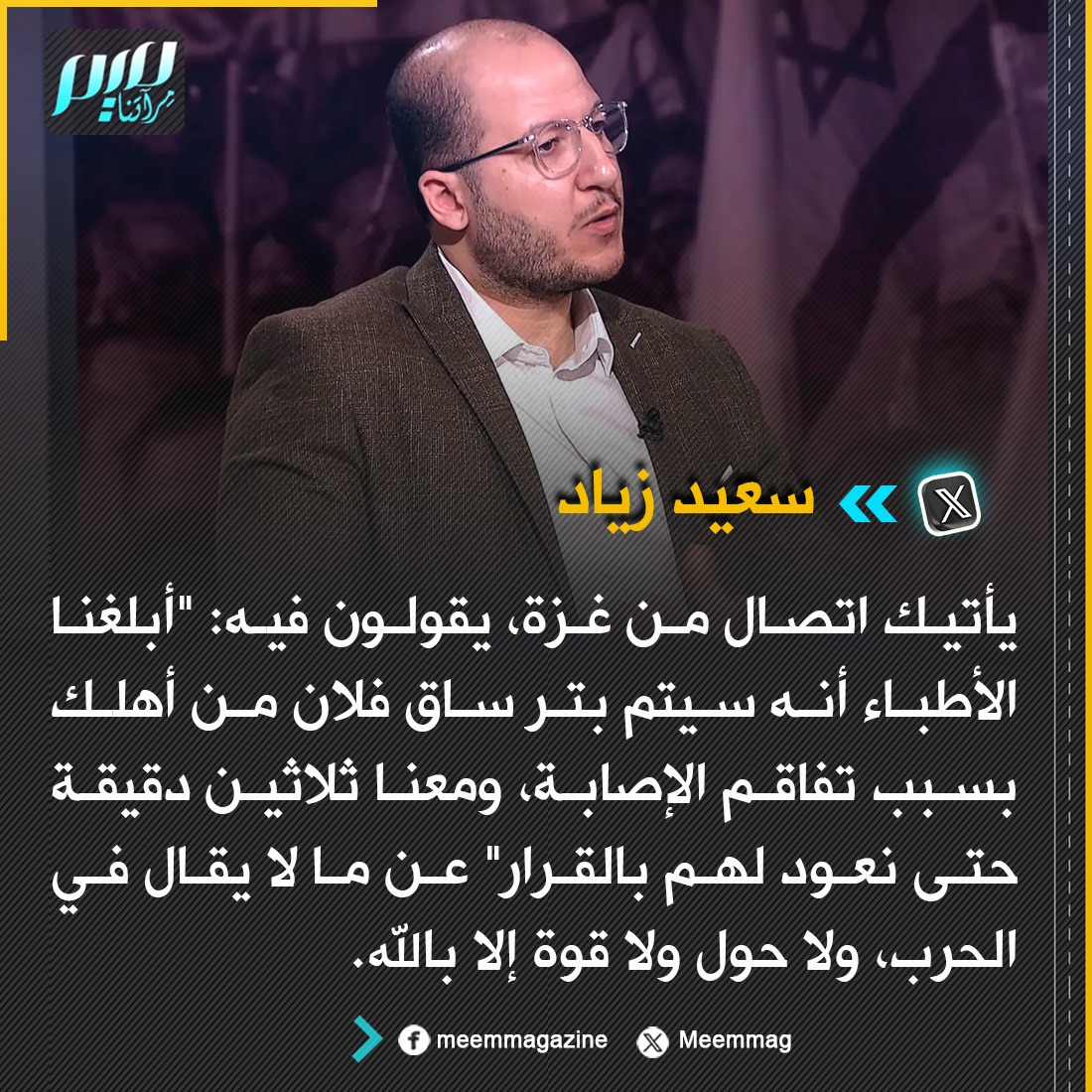 زياد: يأتيك اتصال من غزة، يقولون فيه: "أبلغنا الأطباء أنه سيتم بتر ساق فلان من أهلك بسبب تفاقم الإصابة، ومعنا ثلاثين دقيقة حتى نعود لهم بالقرار" عن ما لا يقال في الحرب، ولا حول ولا قوة إلا بالله.