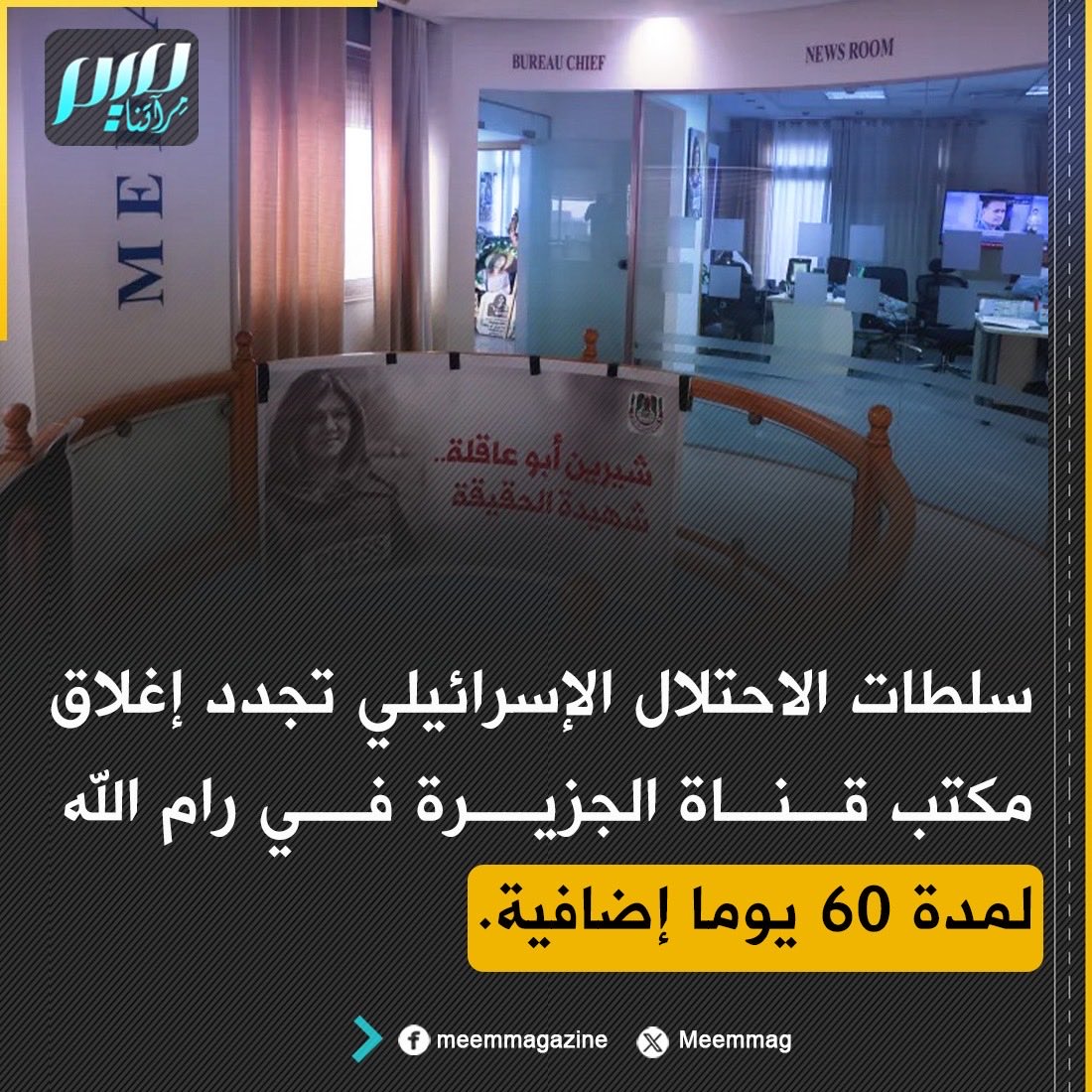سلطات الاحتلال الإسرائيلي تجدد إغلاق مكتب قناة الجزيرة في رام الله لمدة 60 يوما إضافية.
