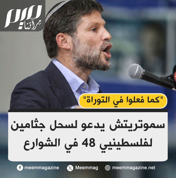 "يجب وضعها في عربة، وسحبها إلى وسط المدينة، مثلما كانوا يفعلون في التوراة".. وزير المالية الإسرائيلي بتسلئيل سموتريتش يدعو إلى سحل جثـ.ـامين فلسطينيين من الداخل المحتـ.ـل، ليكونوا عبرة لغيرهم. وجاءت الدعوة وفق "معاريف" خلال جلسة للكابينيت، لبحث تسليم جثامين شهـ.داء من أراضي 48، اتهموا بتنفيذ عمليات.