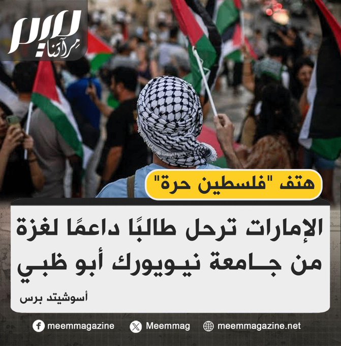 صاح "فلسطين حرة".. الإمارات ترحل طالبًا من جامعة نيويورك أبو ظبي، على خلفية استلامه شهادته في حفل التخرج، مايو الماضي، وهو يرتدي الكوفية ويهتف دعمًا لغزة. ما تعليقكم؟