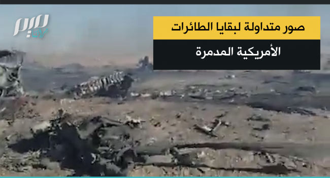 مواقع إيرانية تتداول صورا لبقايا الطائرات الأمريكية المدمرة خلال مهمة إنقاذ الطيار.