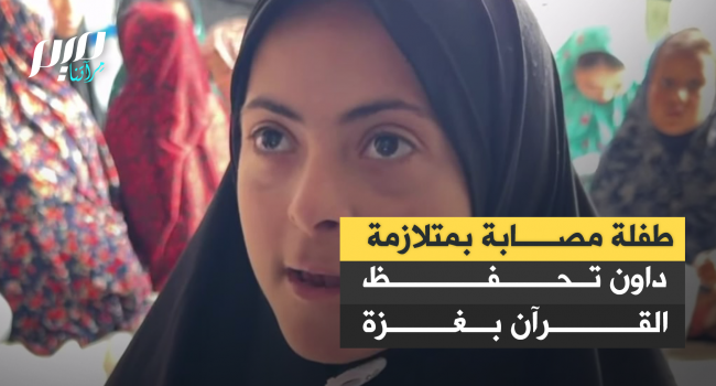 طفلة فلسطينية مصابة بمتلازمة داون تحاول حفظ القرآن الكريم وتسميعه في إحدى خيمات رعاية وتعليم الأطفال بقطاع غزة.