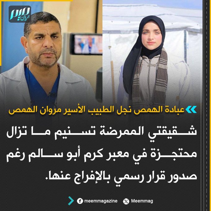 عبادة الهمص: شقيقتي الممرضة تسنيم ما تزال محتجزة في معبر كرم أبو سالم رغم صدور قرار رسمي بالإفراج عنها.