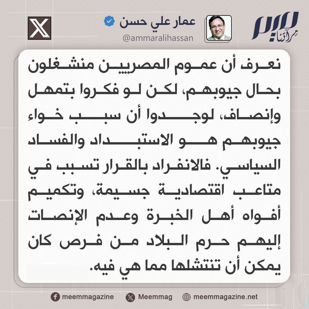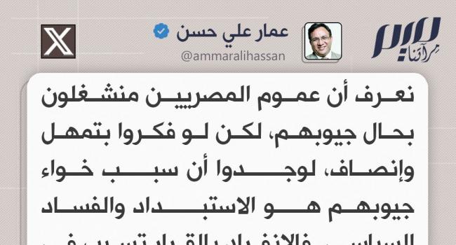 عمار علي حسن: نعرف أن عموم المصريين منشغلون بحال جيوبهم، لكن لو فكروا بتمهل وإنصاف، لوجدوا أن سبب خواء جيوبهم هو الاستبداد والفساد السياسي.
