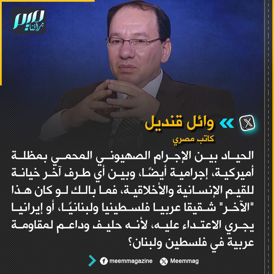 قنديل: الحياد بين الإجرام الصهيوني المحمي بمظلة أميركية، إجرامية أيضًا، وبين أي طرف آخر خيانة للقيم الإنسانية والأخلاقية، فما بالك لو كان هذا "الآخر" شقيقا عربيا فلسطينيا ولبنانيًا، أو إيرانيا يجري الاعتداء عليه، لأنه حليف وداعم لمقاومة عربية في فلسطين ولبنان؟