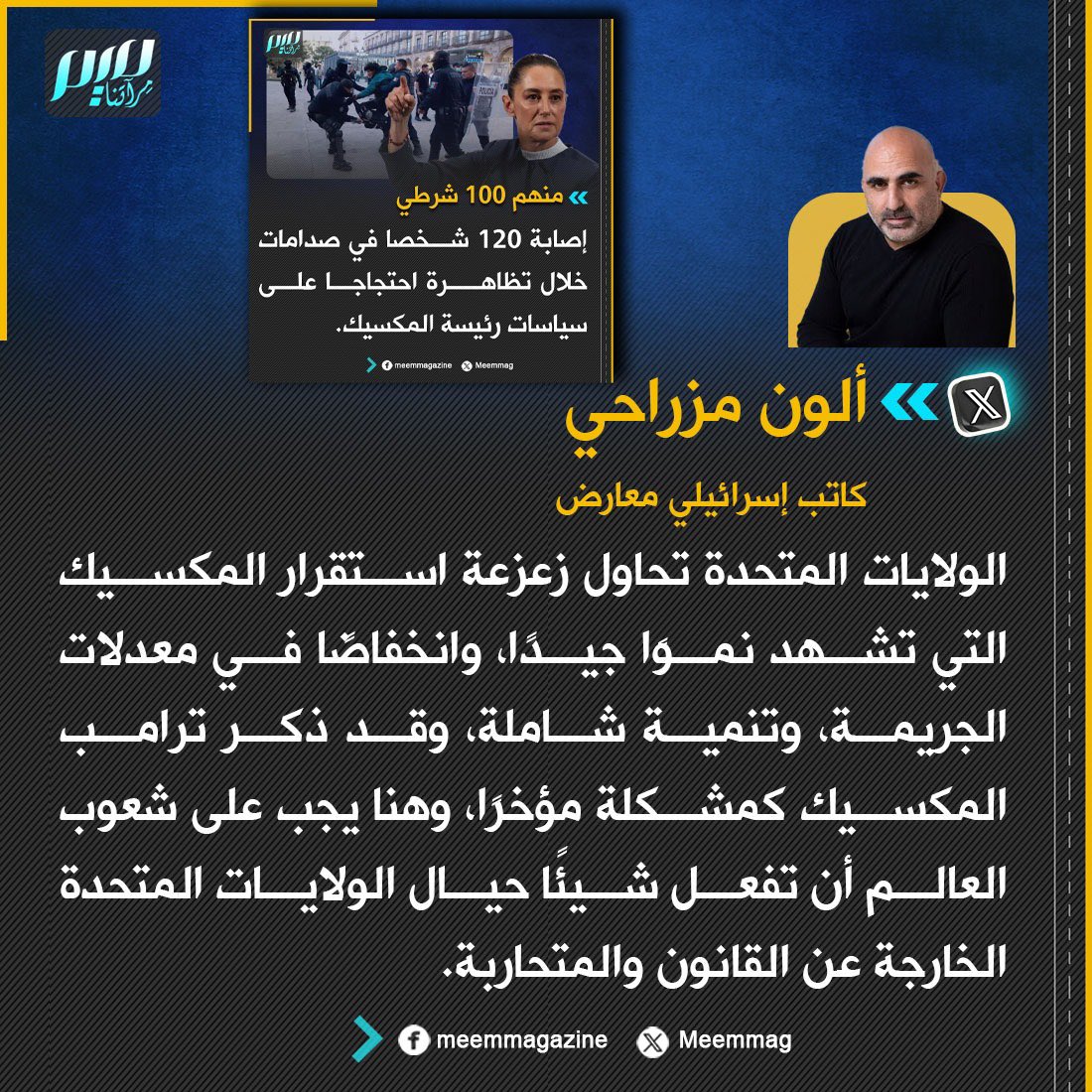 كاتب إسرائيلي معارض: الولايات المتحدة تحاول زعزعة استقرار المكسيك التي تشهد نموًا جيدًا، وانخفاضًا في معدلات الجريمة، وتنمية شاملة، وقد ذكر ترامب المكسيك كمشكلة مؤخرًا، وهنا يجب على شعوب العالم أن تفعل شيئًا حيال الولايات المتحدة الخارجة عن القانون والمتحاربة.