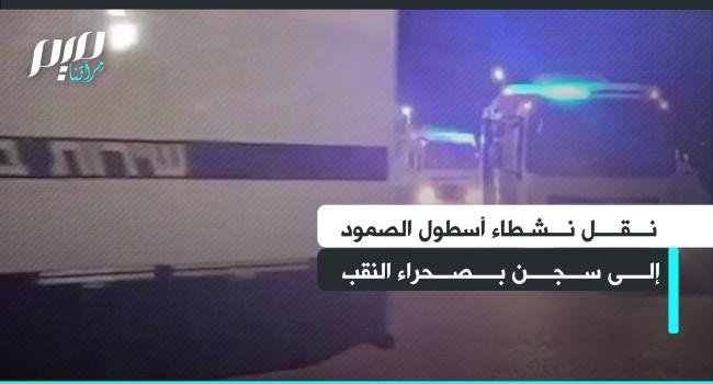 لحظة نقل جيش الاحتلال الإسرائيلي عددًا من نشطاء أسطول الصمود العالمي إلى سجن كتسيعوت في صحراء النقب.